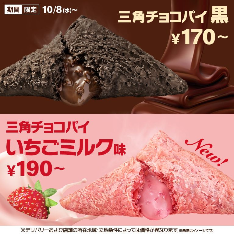 販売期間: ・「三角チョコパイ いちごミルク味」10月8日~10月下旬予定 ・「三角チョコパイ 黒」10月8日~12月下旬予定 価格: ・「三角チョコパイ いちごミルク味」(190円~) ・「三角チョコパイ 黒」(170円~) ※価格は店舗により異なる