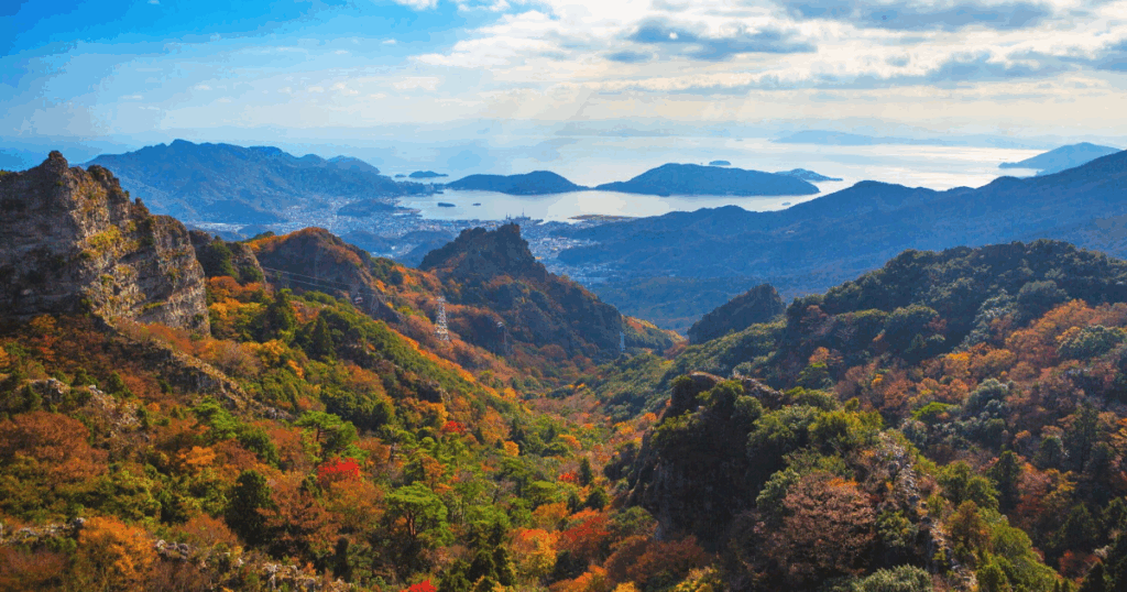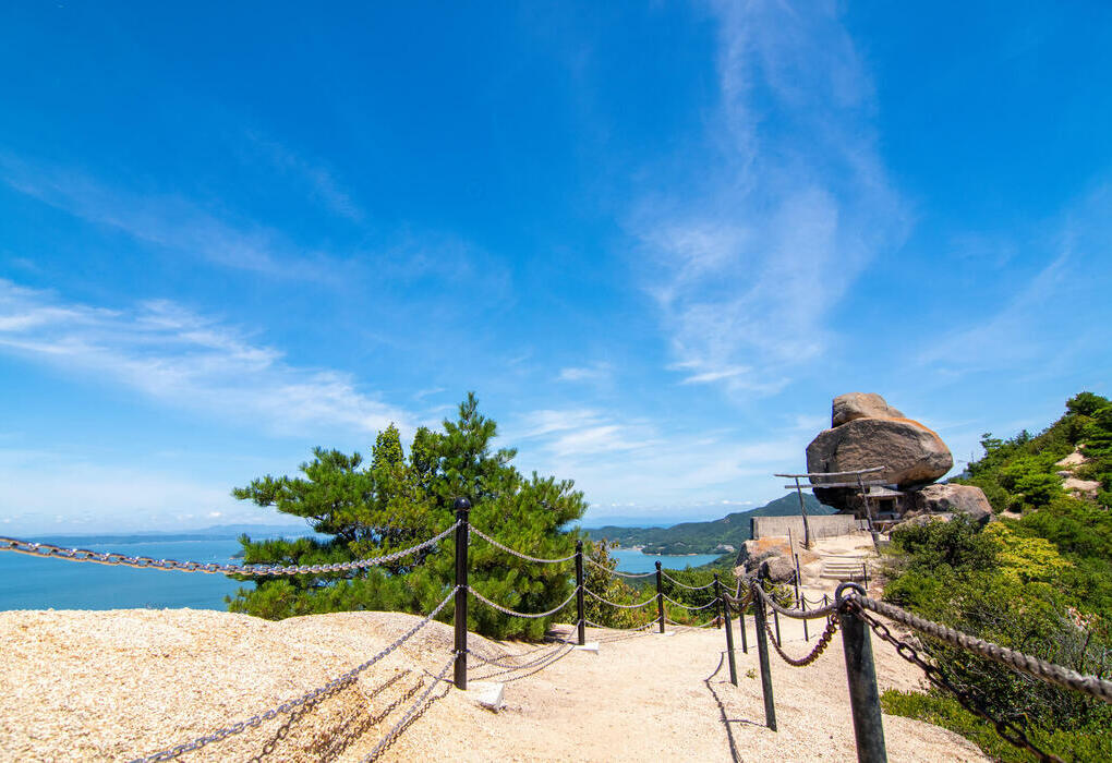 - ロープウェイで山頂まで登ると、瀬戸内海と小豆島の絶景が広がります。