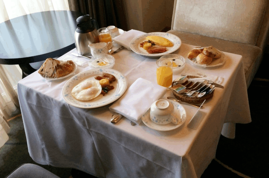 朝はホテルの朝食やルームサービスでゆったりモーニング。