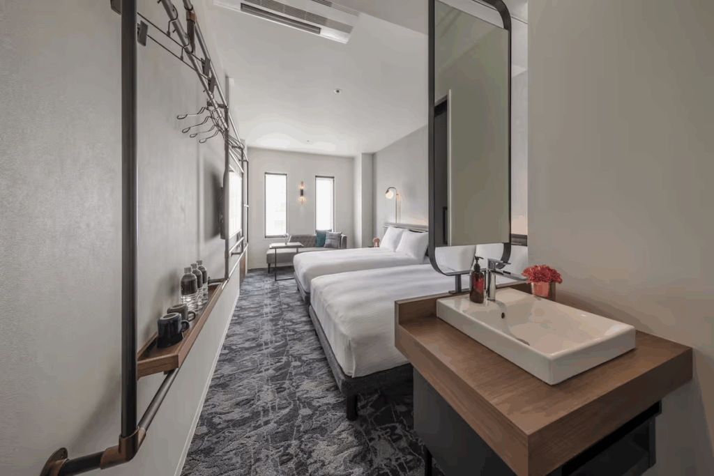 - マリオット系列のデザインホテル。ピンク×ネオンのポップな内装。